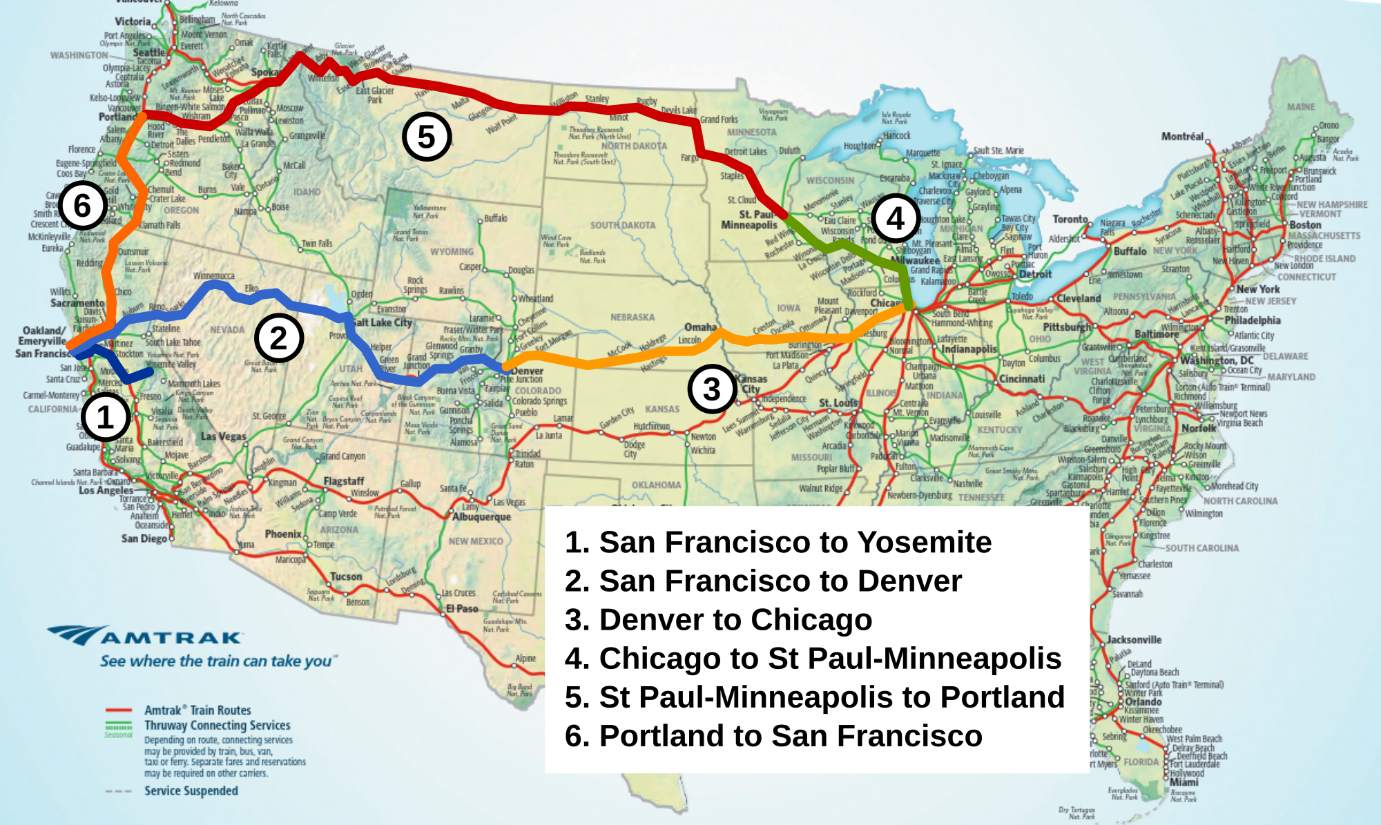 We're traveling el-cheapo in coach class breaking the journeys up into manageable chunks: San Francisco > Denver > Chicago > St Paul-Minneapolis > Portland > San Francisco.